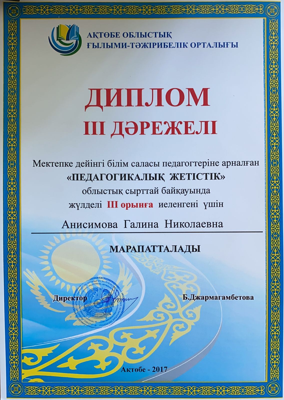 Ұстаздар күні қарсаңында Бондарева Татьяна Анатольевна Ақтөбе қаласы білім бөлімінің Алғыс хатымен марапатталды!