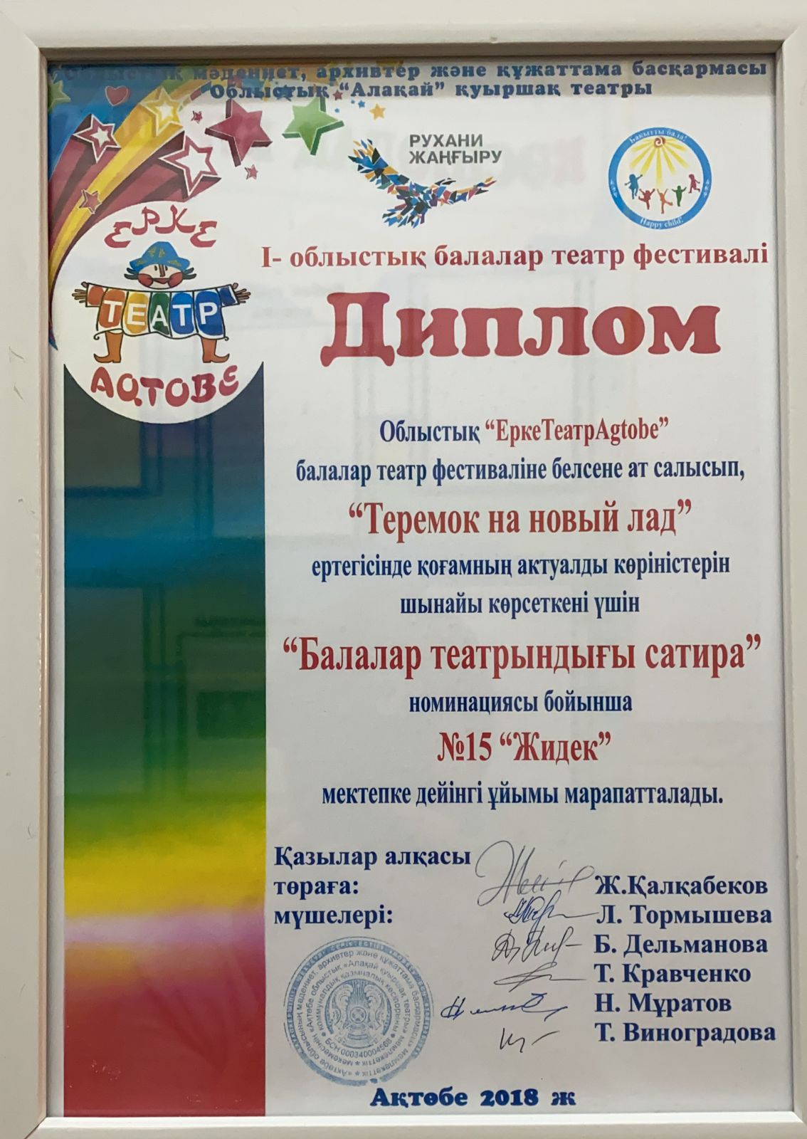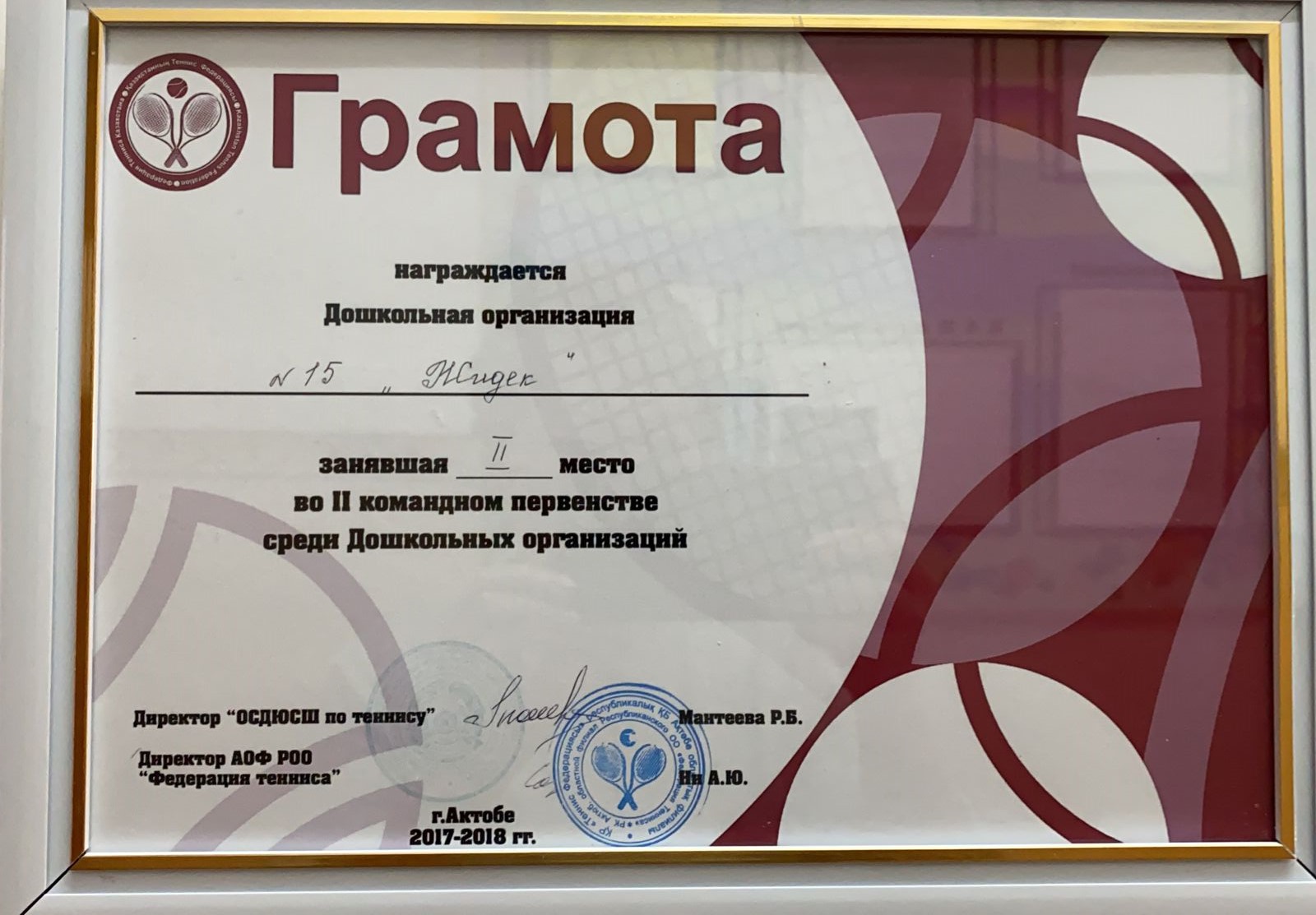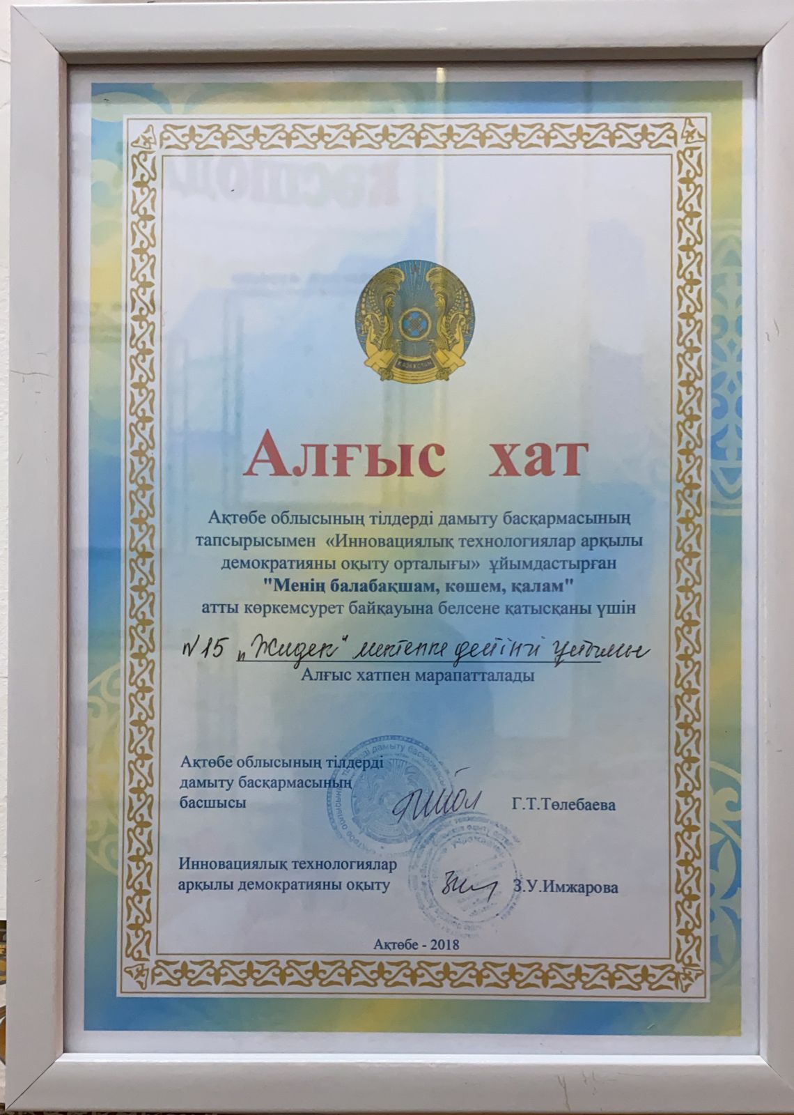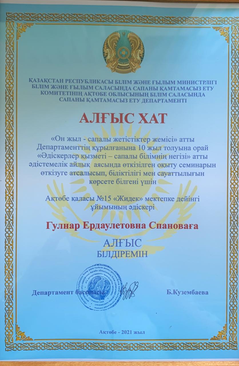 Ұстаздар күні қарсаңында 15 “Жидек” бөбекжай балабақшасының меңгерушісі Иманова Гүлсая Қартбайқызы Қазақстан Республикасы Ақтөбе қаласы Алматы ауданы әкімдігінің Алғыс хатымен марапатталды.