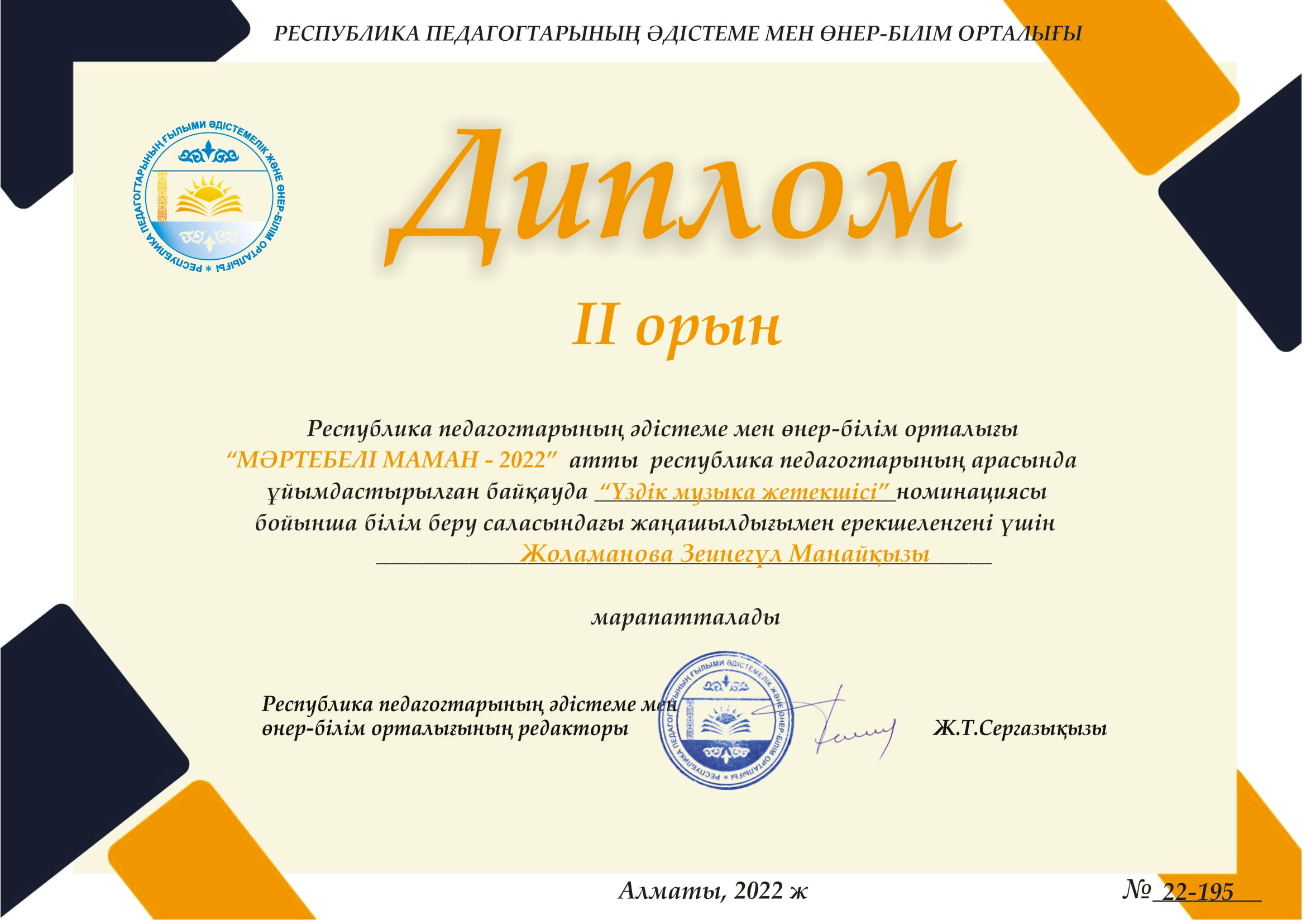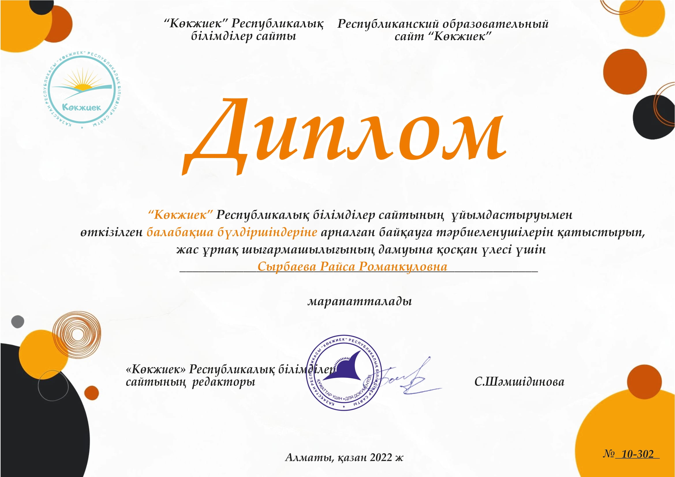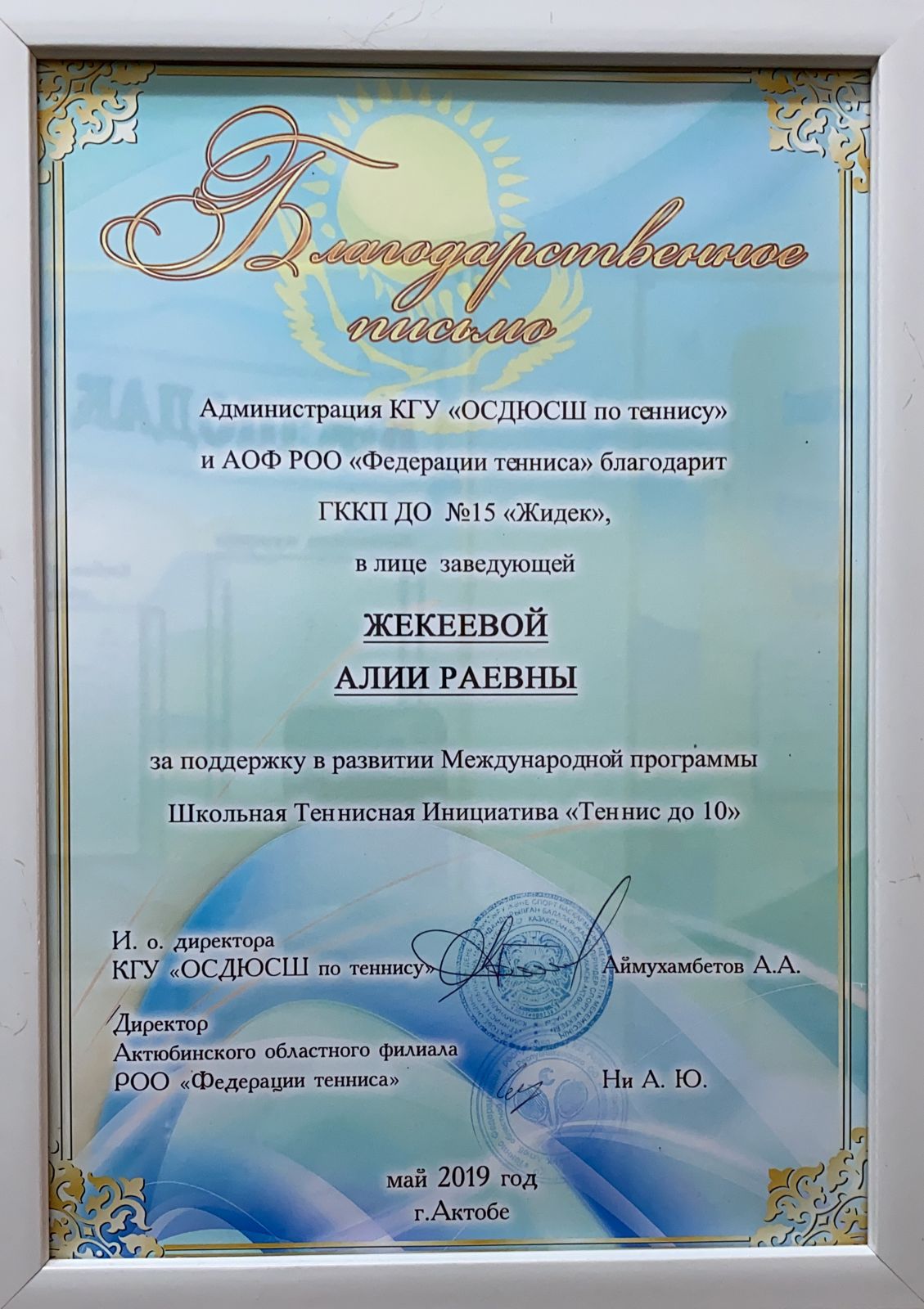 Ұстаздар күні қарсаңында 15 “Жидек” бөбекжай балабақшасының меңгерушісі Иманова Гүлсая Қартбайқызы Қазақстан Республикасы Ақтөбе қаласы Алматы ауданы әкімдігінің Алғыс хатымен марапатталды.