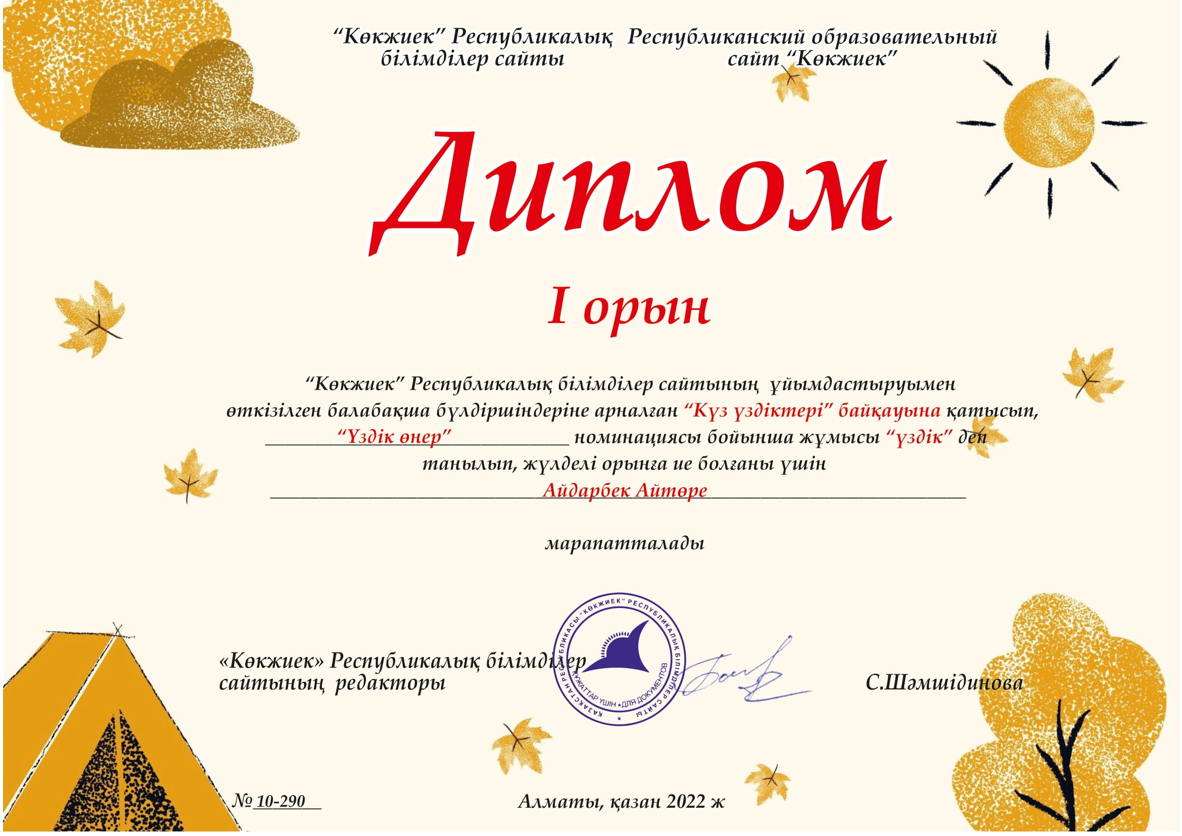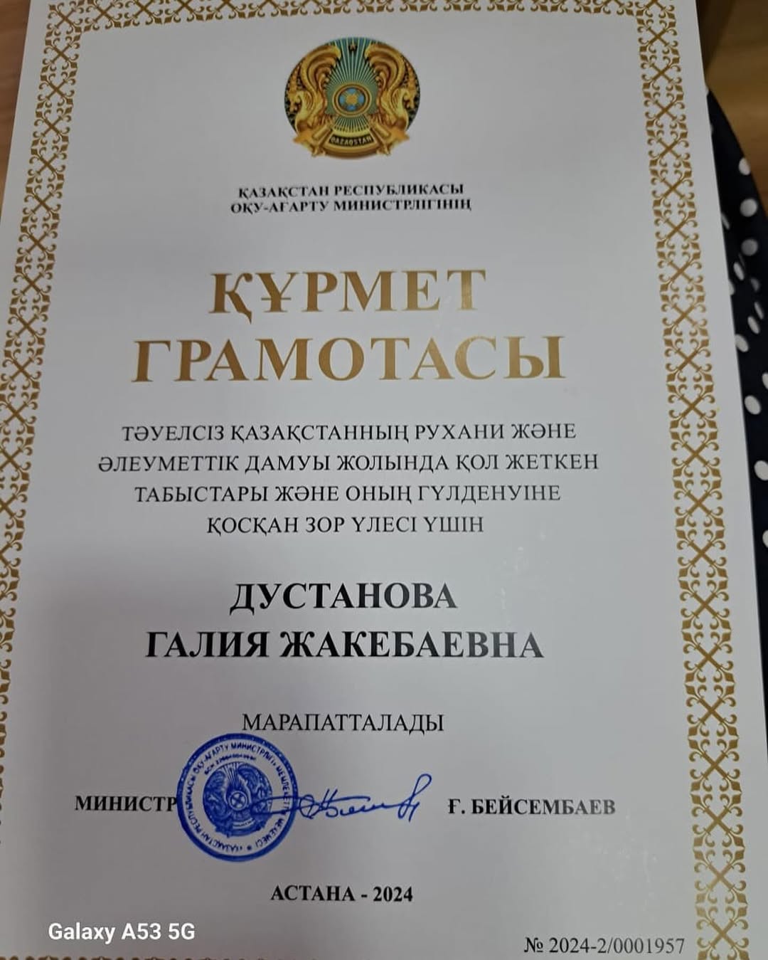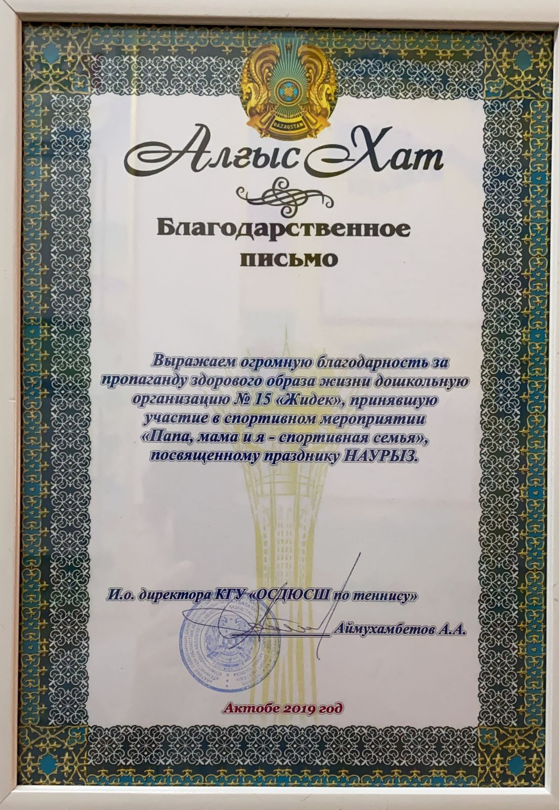 Ұстаздар күні қарсаңында бақшамыздың дене шынықтыру маманы Айсауле Орынтаевна 15 ”Жидек” бөбекжай балабақшасы МКҚК Алғыс хатымен марапатталды!