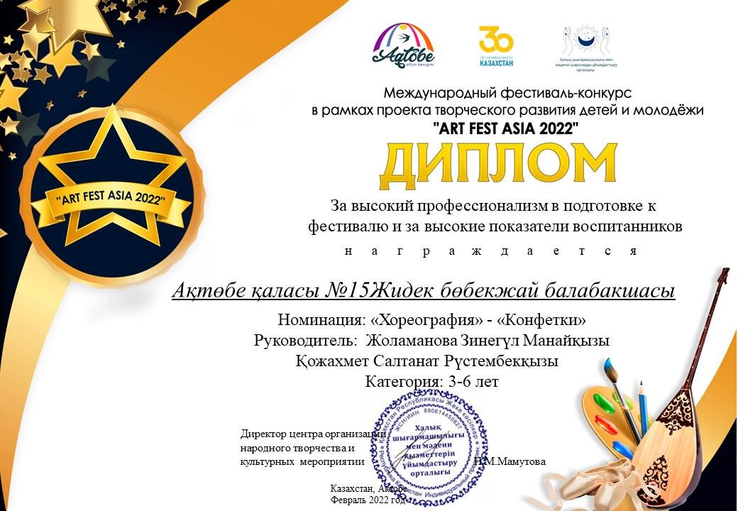 № 15 «Жидек» бөбекжай-балабақшасының тәрбиеленушілері «Art Fest Asia 2022» балалар мен жастарды шығармашылық дамыту жобасының аясында өткен халықаралық фестиваль – байқауға қатысып, «Хореография» бөлімі бойынша «Конфетки» биімен жүлделі ІІ орынды иеленді. Музыка жетекшісі Жоламанова З.М., тәрбиешісі Қожахмет С.Р.